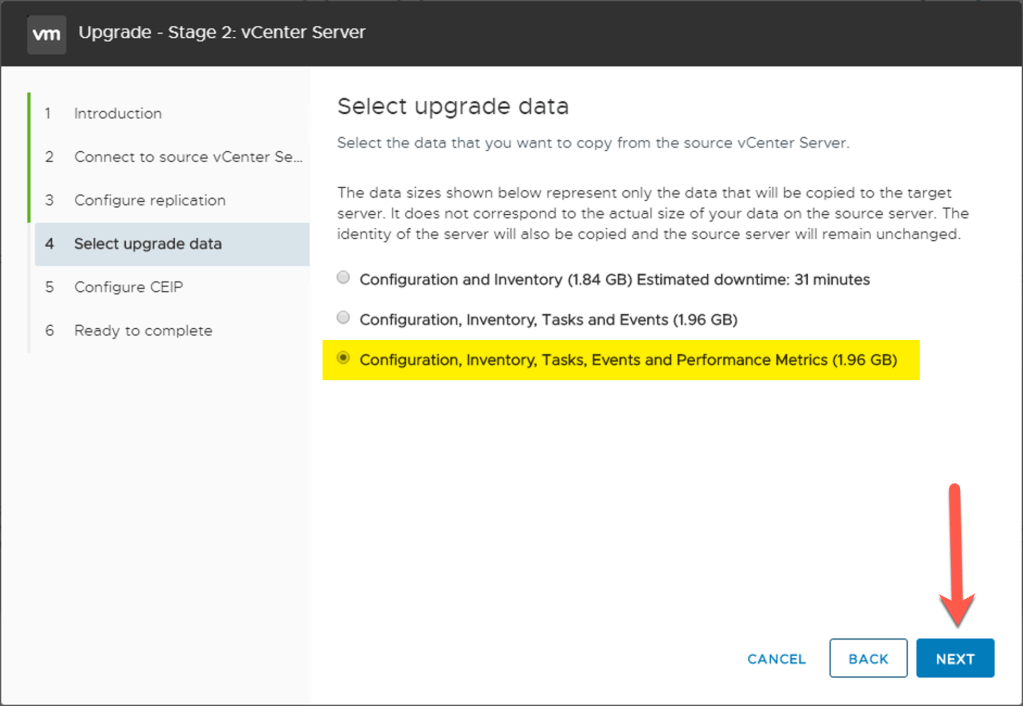 6. Now we are into Phase 2 of the upgrade procedure where we begin configuring the new appliance and select which data we want migrated from the old to the new appliance. Follow the wizard and read the pre-upgrade results (messages) thoroughly one by one as they continue important information.