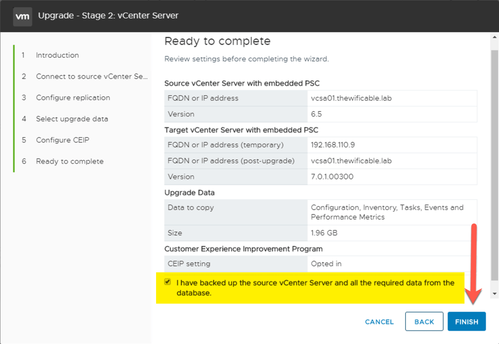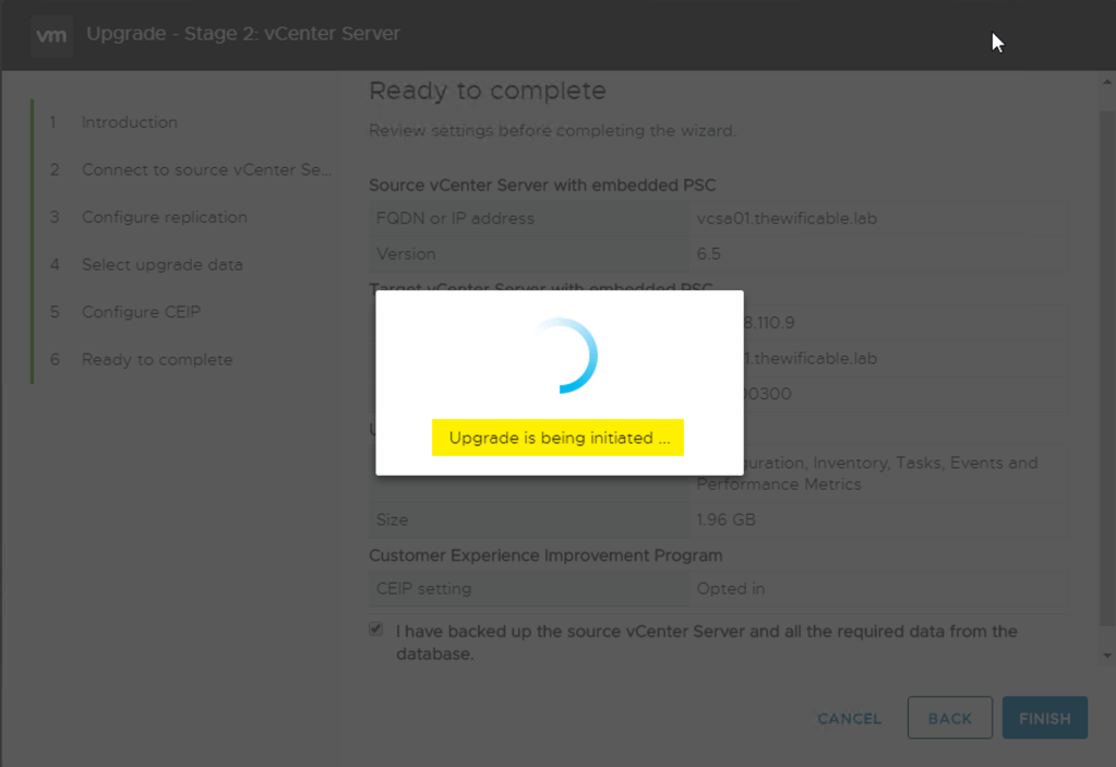 8. To finalize the procedure I will choose which data I want to copy from the source, enable/disable CEIP and then complete Phase 2. You will see a ‘Shutdown Warning’ during this period of time which happens when the cutover from the older 6.5 appliance to the new 7.0 appliance takes place. The temporary IP address is released and the new appliance takes on the persona of the old appliance.