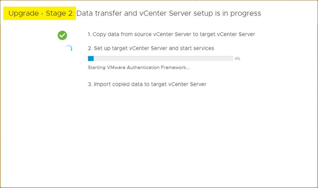 5. The upgrade procedure will then begin. Monitor the upgrade process carefully and with patience. When the appliance is successfully deployed in parallel, Stage 1 will then be complete. Click Continue when the screen appears.