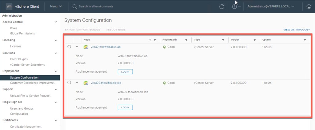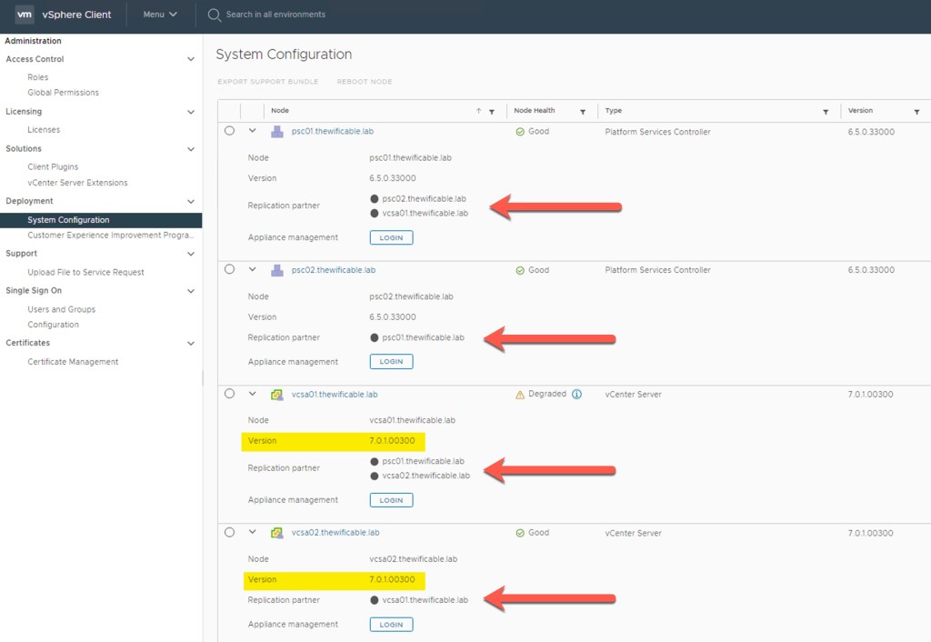 12. The upgrade of the second vCenter Server ‘VCSA02’ completes and now the new topology appears within the vSphere Client as seen below. If you reference the highlighted areas, the VCSA appliances are now running 7.0. In addition to this information, the arrows are pointing to the replication partners for each appliance. This is important to document or make note of as it will help us with the decommission procedure for the PSC’s running on 6.5 appliances.