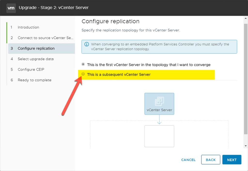 11. Next I shift my focus to upgrading VCSA02 from 6.5 to 7.0 and I begin this procedure by following the same steps above for VCSA01 with some minor modifications. The biggest difference between VCSA02 and VCSA01 takes place during phase two of the upgrade. This is when I select the option ‘This is a subsequent vCenter Server’ when configuring replication.